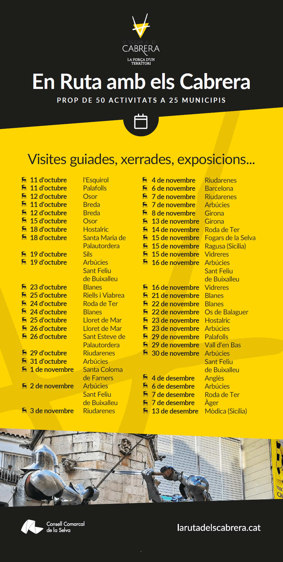 Al llarg dels dies que ha es van desenvolupar les activitats es va poder visitar l’exposició del projecte Vescomtat de Cabrera a la biblioteca Joan Rigau i Sala. Per aquesta ocasió es va ampliar l’exposició produint materials divulgatius sobre diferents aspectes que vinculen Vidreres amb el Vescomtat de Cabrera. Dissabte 18 de novembre es va dur a terme una xerrada sobre el Vescomtat de Cabrera a càrrec de Joan Llinàs, historiador i arqueòleg i Àngel Vàzquez, tècnic del Consell Comarcal de la Selva. Per últim, diumenge 19 de novembre es va organitzar una caminada popular fins al castell de Sant Iscle, i en arribar, es va fer una visita al castell a càrrec de Joan Llinàs, director de les excavacions arqueològiques realitzades al propi castell (activitat organitzada pel Grup Vitraris). El mateix dia, en el marc de la X Trobada d’escudelles, ranxos i sopes històriques, els assistent van poder gaudir de la recreació històrica del vescomte Guerau VI de Cabrera.
